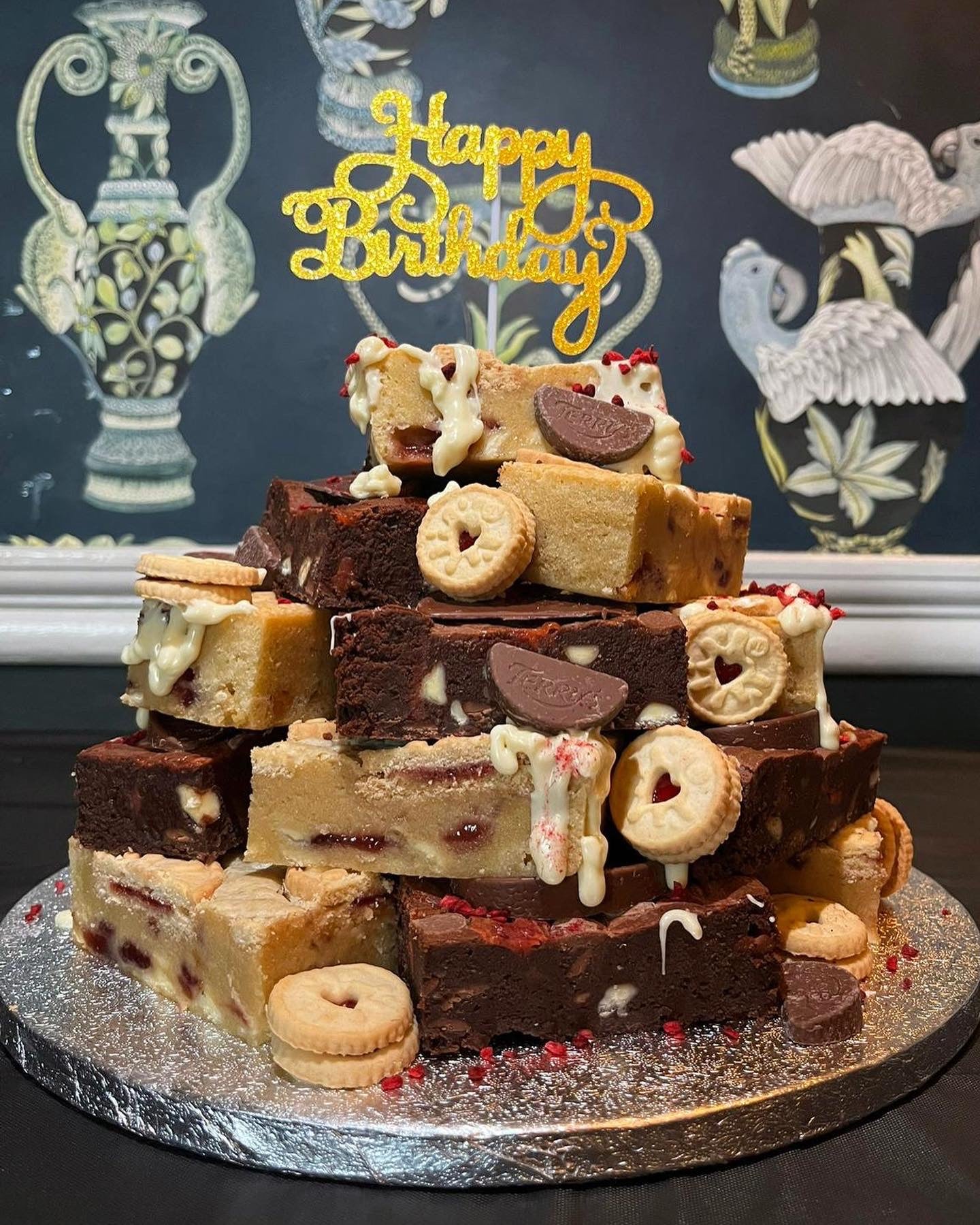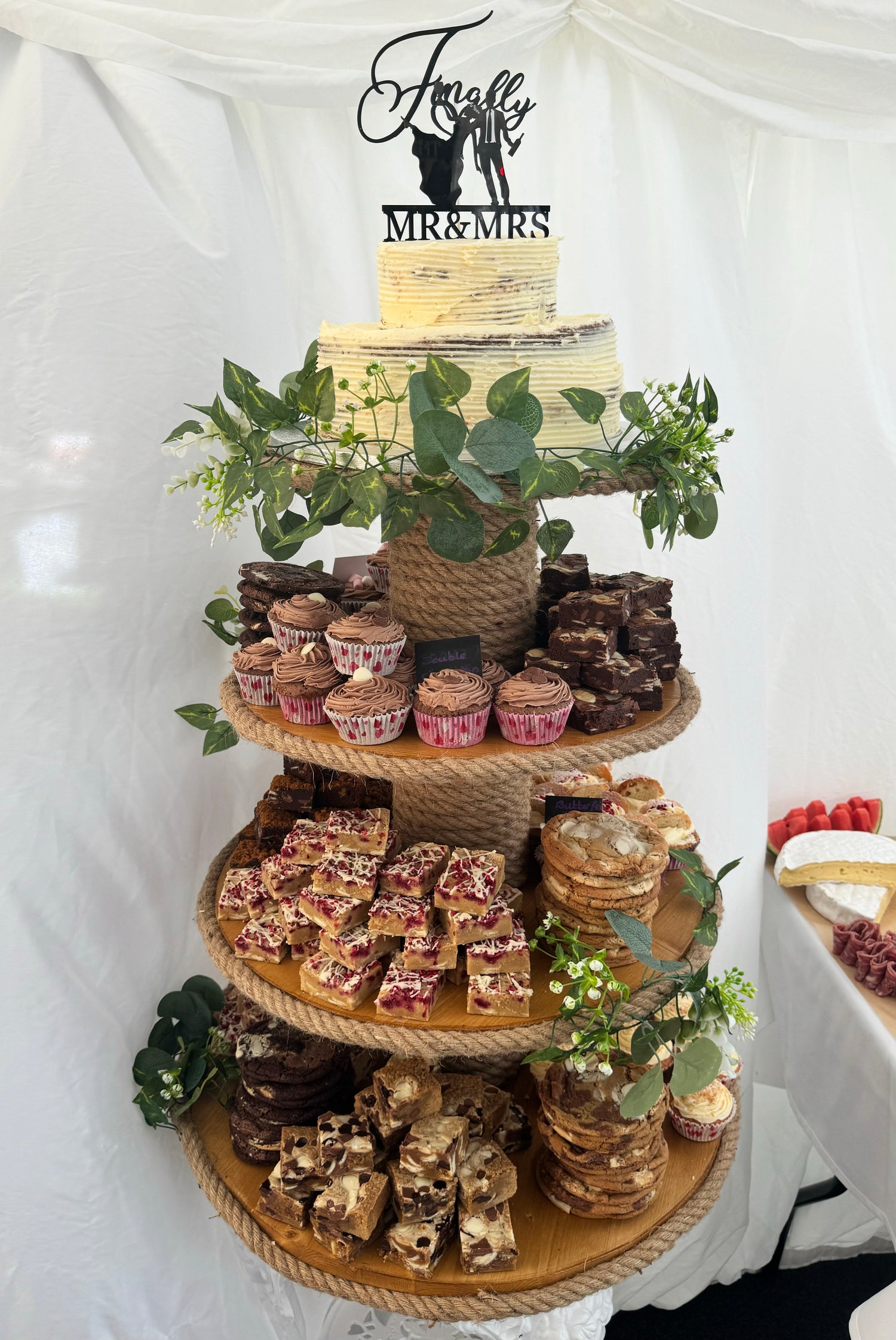 This is completely customisable and can include brownies, blondies, cookies & cupcakes. We also offer the choice of acake to go on the top of the cake (8" or 10" single tier).