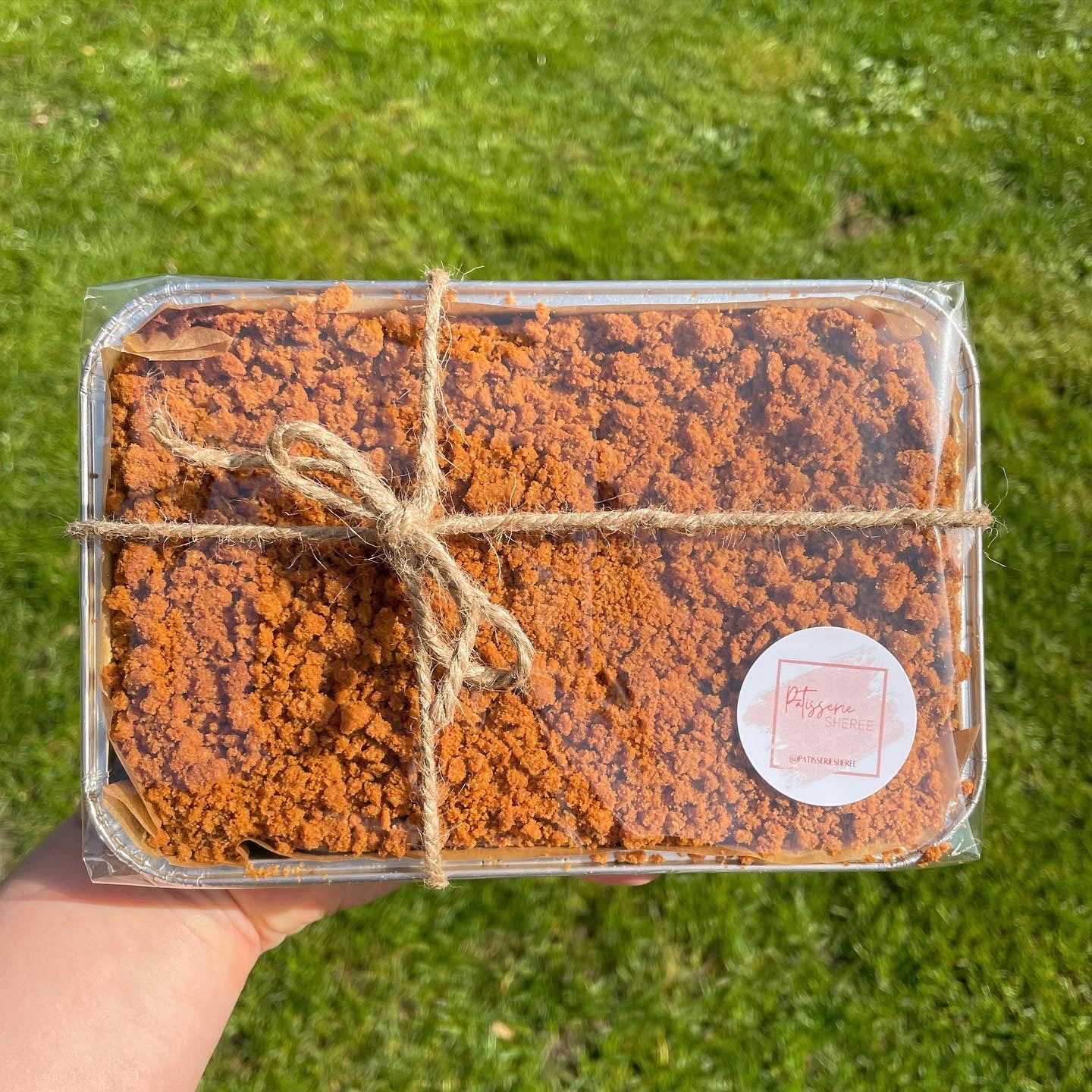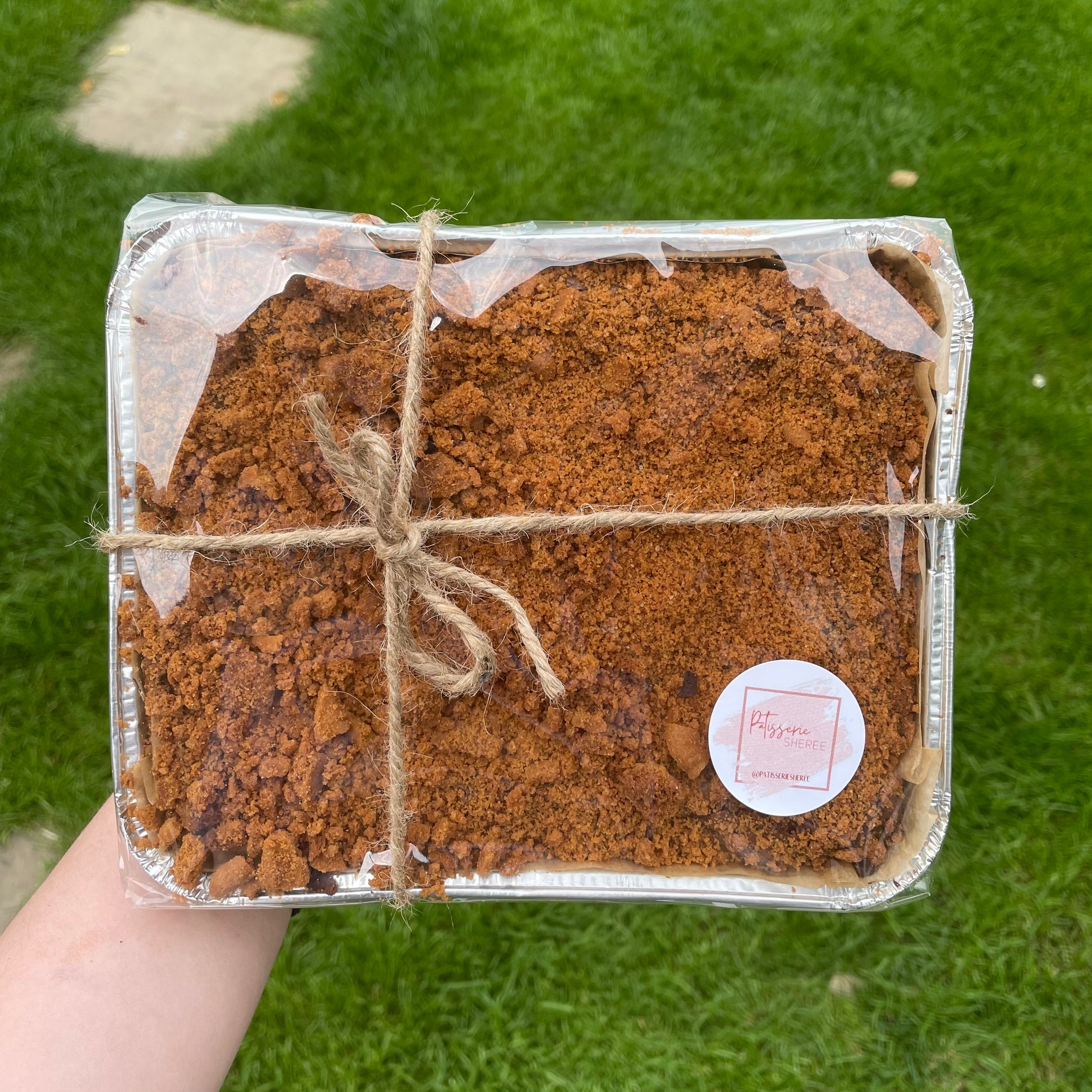 70.5% Belgium Callebaut chocolate brownie filled with biscoff spread and white chocolate chunks, topped with a layer of crushed biscoff biscuits.