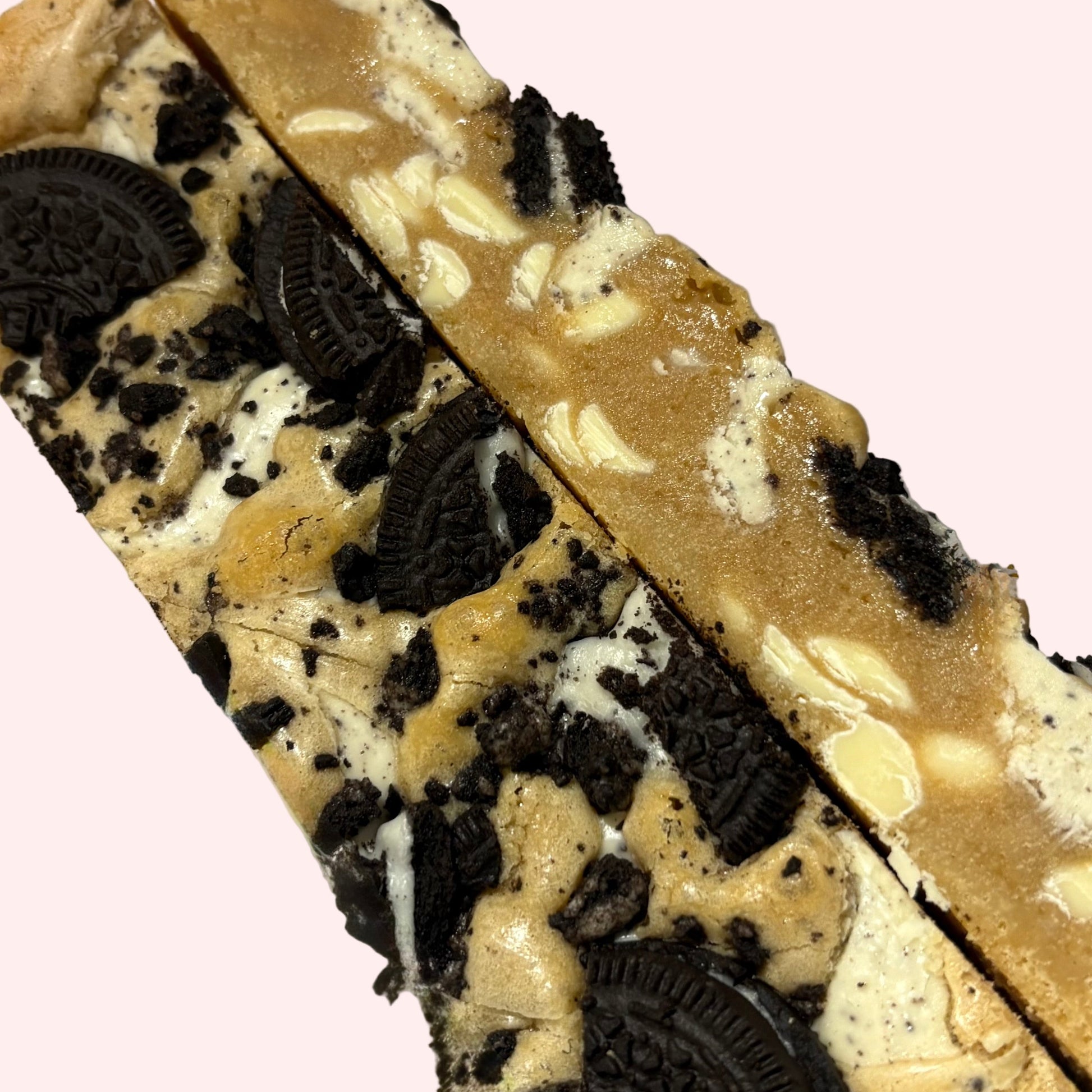 Our classic blondie swirled through with cookies & cream spread, white chocolate chunks, then topped with Oreos