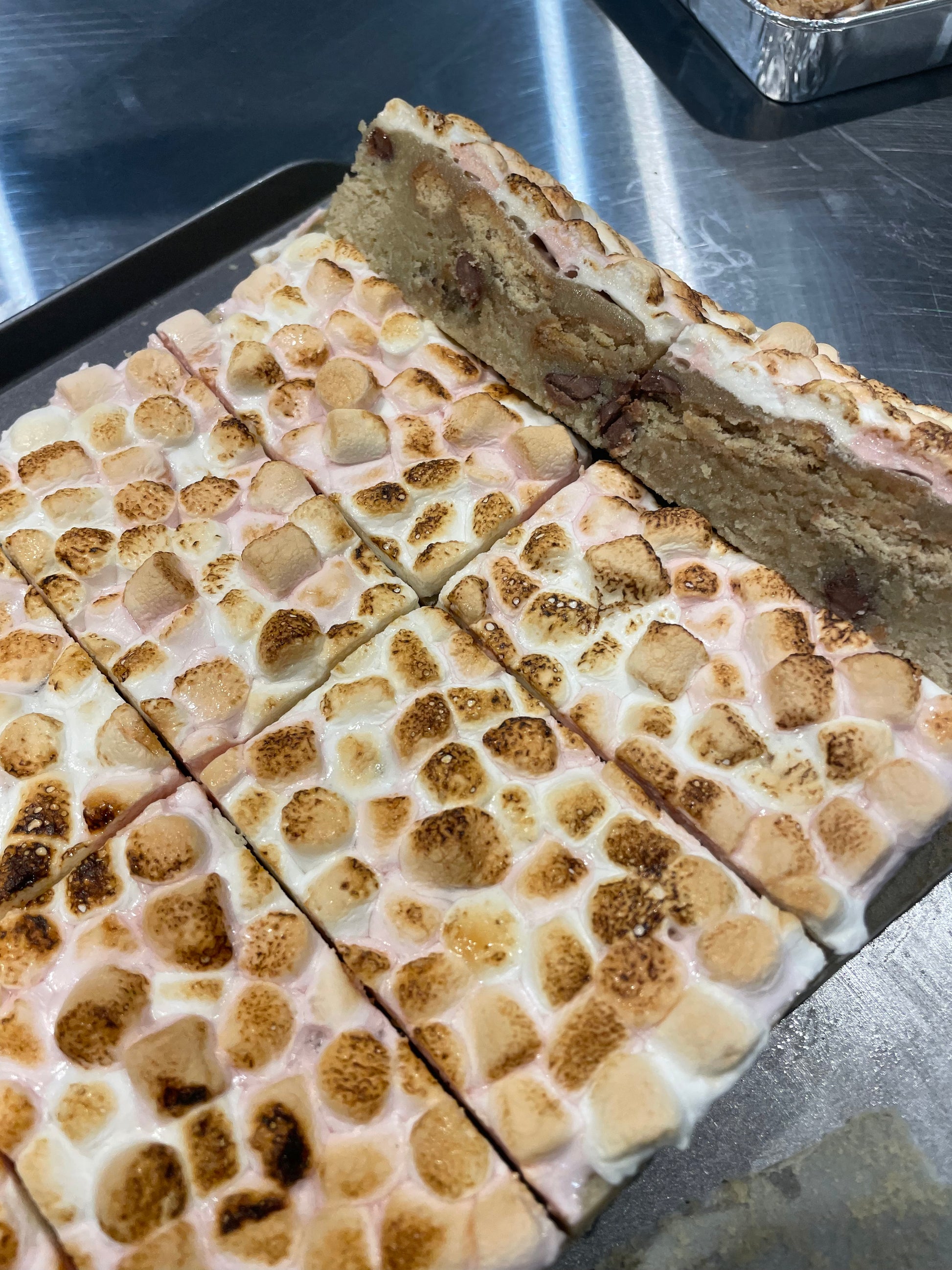 Vanilla flavoured blondie filled with Belgium Callebaut milk chocolate, crushed digestives and topped with toasted marshmallows.
