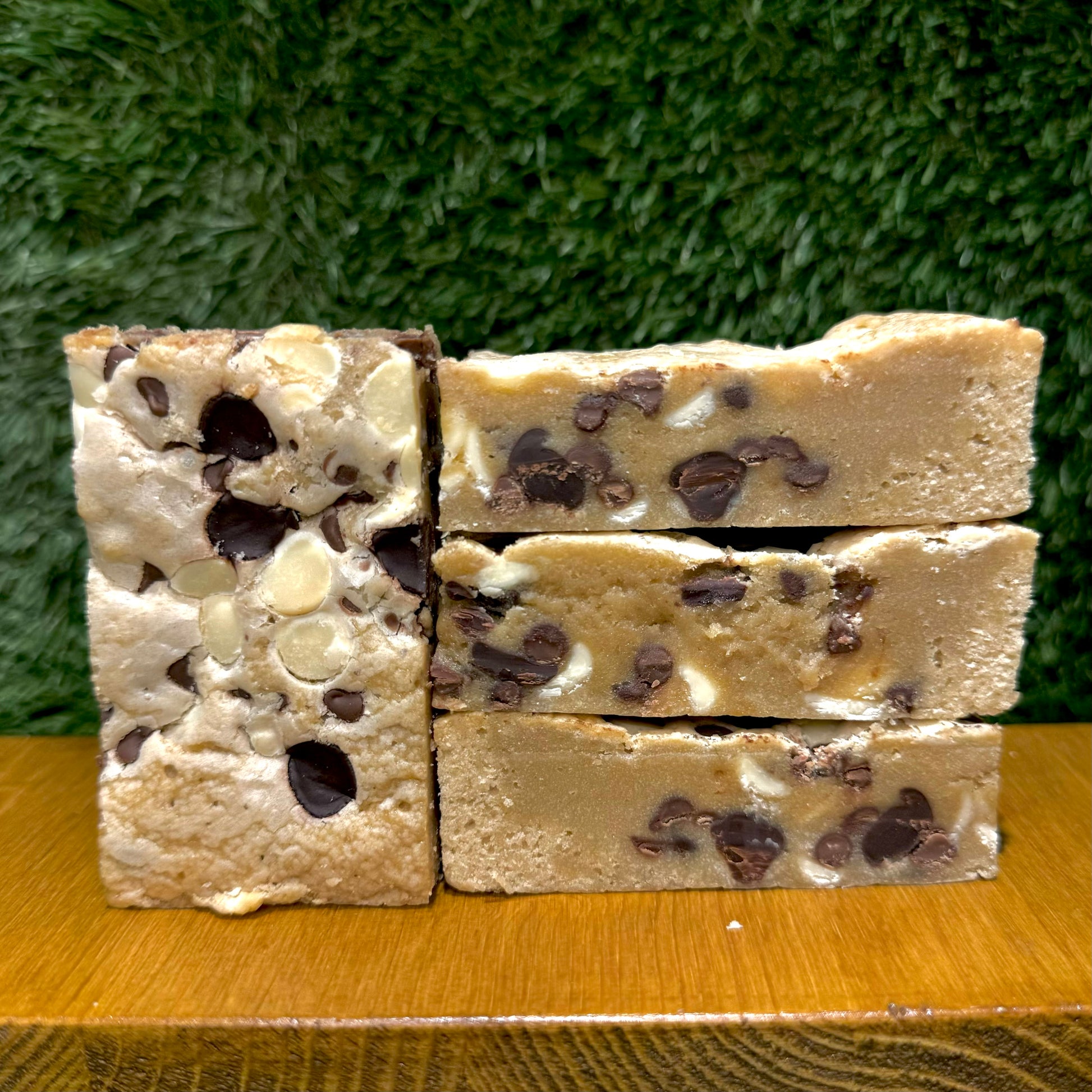 Vanilla blondie filled with white, milk & dark Belgium Callebaut chocolate chunks.
